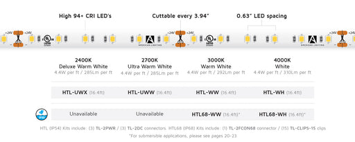 HTL HD HIGH OUTPUT TRULUX,24V,2700K, 100FT RL W/5 TL-CONKITS: Y0409676/TL-2PWR-HD 10MM 2PIN CONNECTOR W/6' CABLE, 3.65W/FT.IP54, 94+CRI, 1.51"CUT, ...