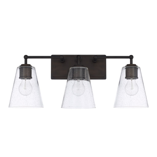 3 light vanity with Old Bronze finish and clear seeded glass.Details:Product Type: Three LightsFinish: Old BronzeShade: Clear Seeded 7``Rooms: Bath...