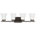 The Bayfield four light vanity fixture in bronze offers shadow-free lighting in your powder room, spa, or master bath room. The Bayfield bath collection by delivers simplicity with flair. The transitional design is a subtle combination of clean lines and flared, angular Satin Etched glass shades to bring style and warmth to the bathroom no matter the budget. Offered in Chrome, Burnt Sienna and Brushed Nickel finishes, the bath lighting collection offers one-light, two-light, three-light and four-light vanity fixtures. Both incandescent lamping and ENERGY STAR-qualified LED lamping are available, all fixtures are California Title 24 compliant.