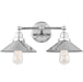 The Hooper two light vanity fixture in chrome provides abundant light for your bath vanity, while adding a layer of today's style to your interior design. The Hooper lighting collection by features exposed lamping and metal shades, pulling inspiration from vintage lighting fixtures from the Industrial Revolution. Two distinct aesthetics can be achieved by choosing either a more modern Chrome or more rustic Antique Bronze finish. A raised accent€ detail on the backplate adds character and visual appeal. Selecting Edison-style filament bulbs (sold separately) will ensure a truly authentic look. Hooper is available in multiple sizes to fit any bathroom space, including a 1-light wall sconce, a 2-light vanity and a 3-light vanity, as well as a 1-light Flushmount option in both finishes. In addition to bathrooms, Hooper would be an awesome lighting option to bring an old-school pharmacy feel and schoolhouse electric vibe to any space.