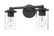 Introduce crisp, modern style and bright illumination over a vanity or in your bathroom with a contemporary two-light vanity fixture. Showcasing timeless design details, its frame receives a distinctive matte black finish while clear glass allows full view of the bulb within, great for grooming and beauty rituals.