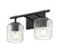 Augment contemporary or traditional design aesthetics with this modern two-light vanity bath light. A rich matte black finish rectangular wall plate and straight arms create contrast and depth, perfect for a variety of bath settings. Ribbed clear glass shades sparkle and seem to undulate when illuminated, adding depth and sophistication.