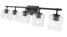 Matte black finishing brings robust style and contrast to the clean, structured design of this modern five-light vanity bath light. Its refined look is enhanced with the sparkling sophistication of its five clear glass shades. Delicate ribbed glass creates a touch of movement and adds resplendent sparkle and elegance.