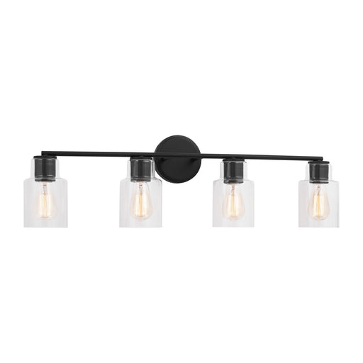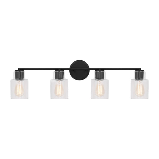 The Codyn four light vanity fixture in Midnight Black is a contemporary take on a classic mid-century design. Clear glass shades with open-ended sp...