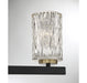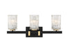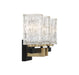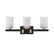 This Keene 3-light bath vanity light is sure to create glamorous sparkle in any bath. The shades of textured clear water glass take center stage here, flanked by pronged hardware finished in black with warm brass. Keene is 9.5" in height, 23" in width and 5" in extension. It uses 3 standard size bulbs of up to 60 watts each (bulbs not included). Damp area rated.