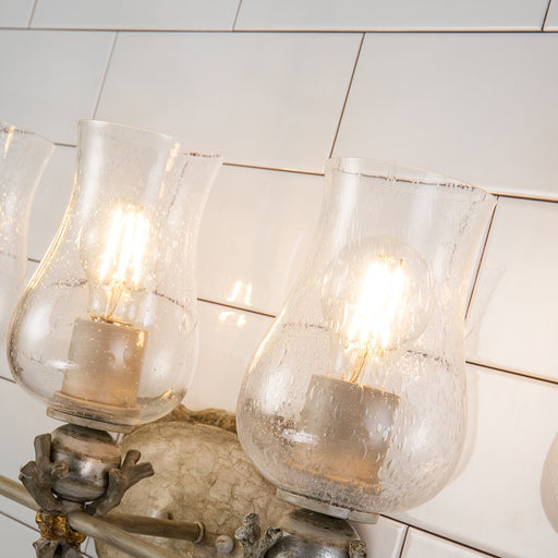 The Trellis 3-Light vanity light is a mix of old and new. With seedy clear glass in the vintage hurricane shape this three-light wall sconces is co...