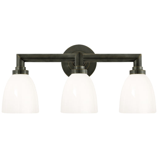 Wilton Triple Bath Light in Bronze with White GlassDetails:Product Type: Three LightsFinish: BronzeShade: White GlassDesigner: Chapman & MyersM...