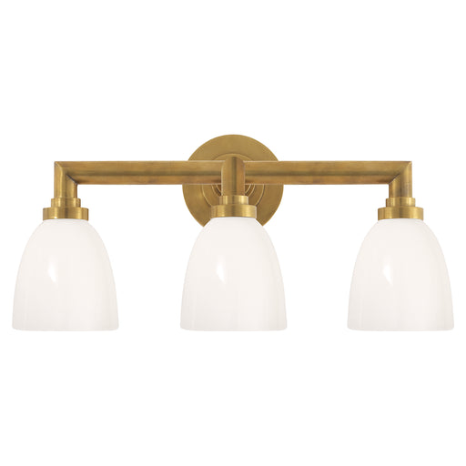 Wilton Triple Bath Light in Hand-Rubbed Antique Brass with White GlassDetails:Product Type: Three LightsFinish: Hand-Rubbed Antique BrassShade: Whi...