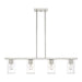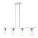 Illuminate your home with a bright design from the Zurich collection. This four-light down linear chandelier features a brushed nickel finish with clear glass. Perfect for a contemporary or transitional luxury kitchen or dining room setting.