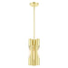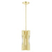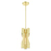 The minimalistic Acra collection was inspired by the industrial landscape of metropolitan cities across Europe and Asia. Delicate tubular shapes are interrupted by clever cutouts to create a visually interesting light distribution. This three-light satin brass finish pendant chandelier will integrate into a contemporary, minimal, urban or sleek interior design setting.