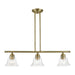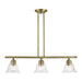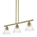 Whether it's style or practical lighting, this linear chandelier is the perfect addition to your kitchen island or dining room. This three-light island fixture from the Moreland Collection features clear hand-blown glass shades and is shown in an antique brass finish. The clean graceful lines of this piece complement the shade, creating a transitional look that works well in most decors. Classic elegance combines with contemporary appeal to enhance any home in style.
