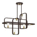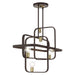 Geometric, dimensional midcentury modern describes the Bergamo collection. This wrought iron piece is finished in bronze and combines with antique brass finish accents. Bulb positions provide a playful engaging warmth and rich glow. The architectural designs of this collection give a new face to modern, loft, transitional or contemporary space. This asymmetrical six light linear chandelier will make a center piece to a large living room, dining room or over the countertop.