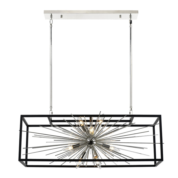 10-Light Modern Rectangular Incased Sputnik Polished Nickel & Matte Black Dining Chandelier.