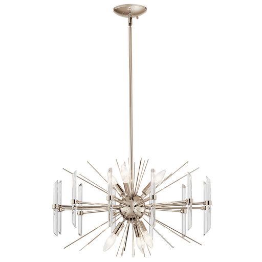 The Eris 15.25" 6 light chandelier has long spiked stems diverge from a polished nickel finish spherical ball while vertically placed crystal rods ...