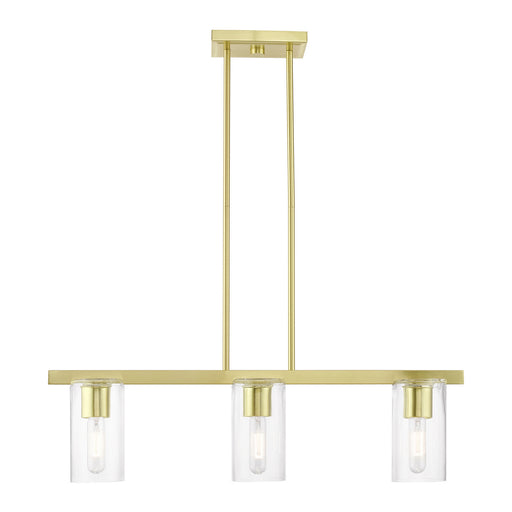 Bring a refined lighting style to your interior with this downtown collection three light linear chandelier. Shown in a satin brass finish with cle...