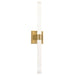 A tubular length of illuminated rod the Rona wall light is supported and clasped with a detailed cylindrical projection. The thick square outline of the attachment plate frames the lamp holder and echoes the refinement of present architectural trim. Available as either a sconce or vanity and in several curated finishes.