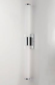 Cylinders of White cased glass are mounted onto a cast aluminum frame of Satin Nickel or Polished Chrome. LED modules evenly illuminate and provide soft yet ample illumination. Multi volt input is standard which allows for installation into commercial applications.