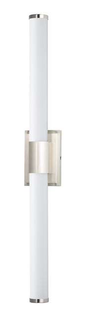 Cylinders of White cased glass are mounted onto a cast aluminum frame of Satin Nickel or Polished Chrome. LED modules evenly illuminate and provide soft yet ample illumination. Multi volt input is standard which allows for installation into commercial applications.