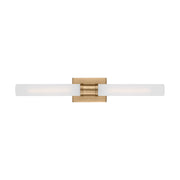 Sleek and modern, this 2-Light bath series pairs a square backplate with tubular etched white opal glass shade. The Keaton two light vanity fixture in Satin Brass provides abundant light for your bath vanity, while adding a layer of today's style to your interior design.