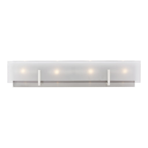 Elegant panels of icy textured glass bring radiant energy and sophistication to a modern four-light vanity bath light. Its minimalist steel frame v...