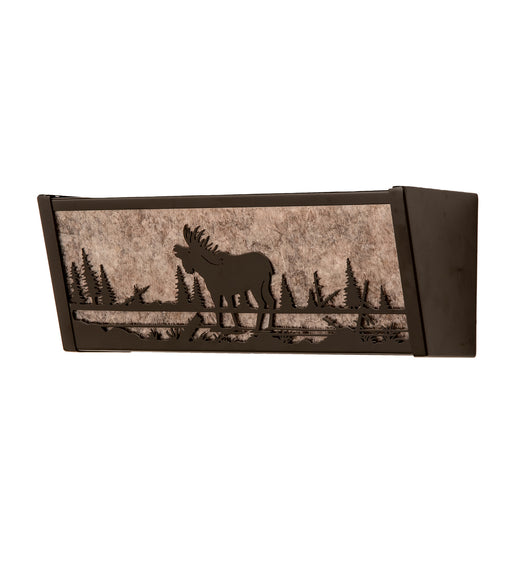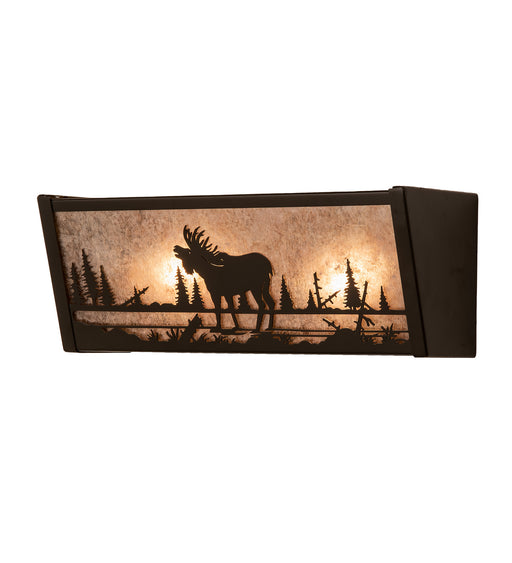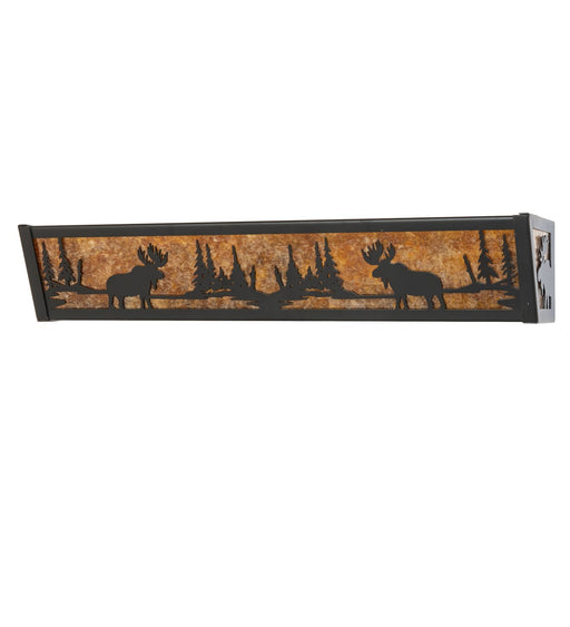 A Moose walks through the woods on this nature inspired vanity light, illuminated through Amber mica panels. The fixture has a Black finish and is ...