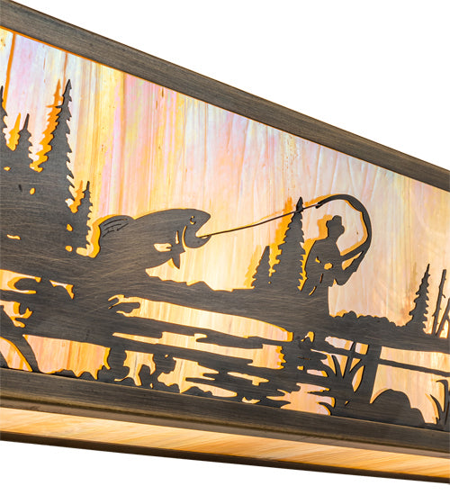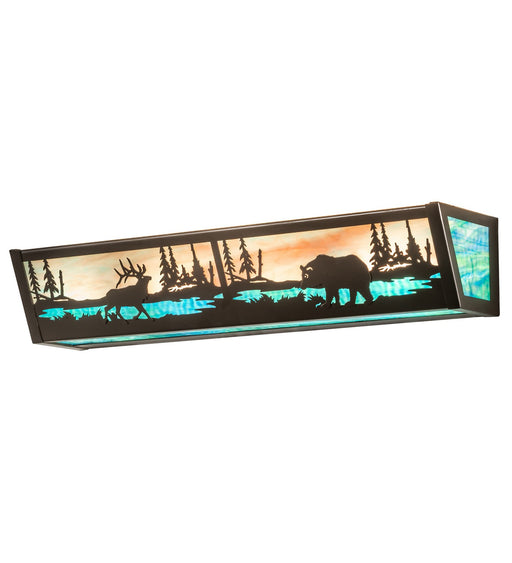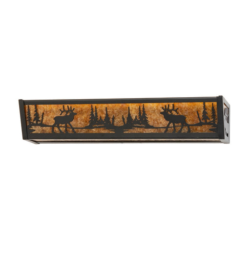An elk wanders beside a calm lake on this nature inspired vanity light, illuminated through Amber mica panels. The fixture has a Black finish and i...