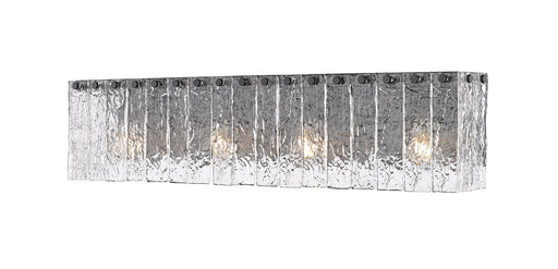 Elegant panels of icy textured glass bring radiant energy and sophistication to a modern four-light vanity bath light. Its minimalist steel frame v...