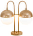 A unique two-light table lamp for reading spaces including desktops, library tabletops, reception areas, work stations and other appropriate settings. Bold, eye-catching appeal integrates classic contoured White Glass orbs which are complemented with a Champagne Metallic finish. The lamp includes 96 inches of hard wire so the base can be attached to furnishing surfaces. Handcrafted by master artisans in our 180,000 square foot manufacturing facility in Yorkville, New York. Shade colors, metal finishes and sizes can be customized to meet your needs. UL and cUL listed for damp and dry locations.