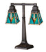 Patterns and colors of Native American blankets and pottery have given inspiration to this Meyda Tiffany designed Mission style stained glass shade. The intricately patterned shade of Bark Brown granite glass with Sand Beige and Turquoise is combined with a clean lined Mission style two light desk lamp base that has an earth toned Mahogany Bronze hand applied finish.