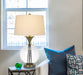 150W 3 way Moxee glass/metal table lamp with hardback taper drum fabric shade