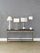 Our Thompson White Console Lamp has a tall, delicate metal body in a brass finish that extends through the vanilla linen shade to its matching finial. Anchored by a square white marble base, this console lamp has an understated profile. The Thompson is also available in a nickel finish with a black marble base.