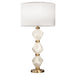 The Argyle Diamond lamp is sculpted in glass as the focal point of this design. Features brass appointments and a brass base. Shown in clear quartz with white fabric shade. Also available in amber agate with beige fabric shade and ebony black and gold aventurine veiling with white or black fabric shade.