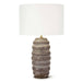 The Ola has been expertly crafted by artisan's hands to achieve the natural, organic look of true earthenware. Finished with a hand-applied, matte glaze, various shades of earthen brown and tan are displayed. The coloring and distressing are further enhanced by the natural, repeating curves that make up the lamp's body. Finished with an aged brass metal disc at the base and drum shade in natural linen at the top, the Ola is the perfect lamp to add to a space that welcomes the imperfect beauty of nature.