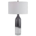 Perfect For Any Room Style, This Art Glass Table Lamp Features A Transitional Style With An Light Gray And Frosted White Ombre Look, Displayed On A Thick Crystal Foot Accented With Brushed Nickel Details. The Lamp Is Paired With A White Fabric Drum Shade.
