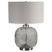Modern Style Table Lamp Features A Translucent Art Glass Base With Abstract Black Flecks Throughout, Accented With Brushed Nickel Details. The Round Hardback Drum Shade Is A Light Gray Linen Fabric With Natural Slubbing.