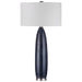 This Handcrafted Ceramic Table Lamp Showcases An Elevated Look With A Striped Motif And A Prussian Blue-gray Glaze. Brushed Nickel Plated Iron Details Accentuate The Design. The Hardback Drum Shade Is Covered In A White Linen Fabric.