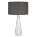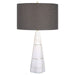 Modern Yet Classic, This Table Lamp Displays An Elegant White Honed Marble Base With Natural Gray Veining And Metal Accents Finished In Antique Brass. A Charcoal Gray Drum Shade Complements The Piece.