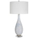 This Ceramic Table Lamp Features An Elegant Fluted Shape With Ribbed Texture Finished In A Soft Blue And White Drip Glaze. The Lamp Sits On A Thick Crystal Foot Paired With Polished Nickel Plated Details. A White Linen Drum Shade Compliments The Piece.