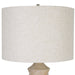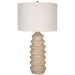 The Uplift Table Lamp Showcases A Geometric Carved Base In A Bleached Wood Tone Look With Nickel Plated Iron Details. The Lamp Is Paired With A Casual Oatmeal Linen Slubbed Drum Shade.