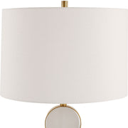 This Table Lamp Brings A Soft Contemporary Flair To Any Room By Featuring Three Suspended Alabaster Disk Surrounded By A Sleek Metal Base Finished In A Plated Brushed Brass. The Round Hardback Shade Is Covered In A Crisp White Linen Fabric.