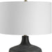 The Graphite Table Lamp Features A Large Ceramic Base In A Distressed Charcoal Finish With Intricate Ribbed Detailing And Antique Brass Plated Hardware. The Round Hardback Drum Shade Is Made In A Casual White Linen Fabric.
