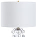 The Aura Table Lamp Features A Clear Glass Base Adorned With Organic Glass Spheres, Set Atop A Plated Brushed Brass Foot. A Round Drum Hardback Shade In A Crisp White Linen Fabric Completes The Piece.