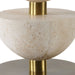 The Meridian Table Lamp Features Stacked Travertine Half-spheres On A Central Plated Brass Base With A Matching Foot. The Slightly Tapered Round Hardback Shade Is Finished In An Off-white Linen Fabric With Light Slubbing.