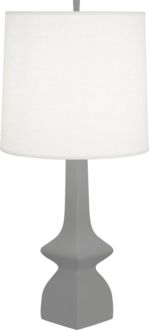 A smooth jug-shaped base in Ceramic Weathered Grey is topped by an off-white linen drum shade. The weathered finish adds texture and a vintage vibe...