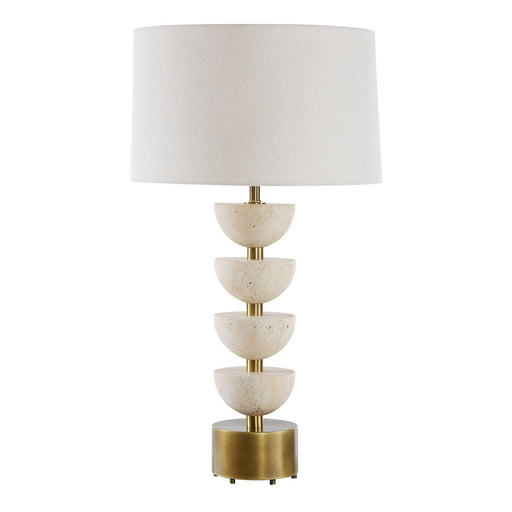 The Meridian Table Lamp Features Stacked Travertine Half-spheres On A Central Plated Brass Base With A Matching Foot. The Slightly Tapered Round Ha...