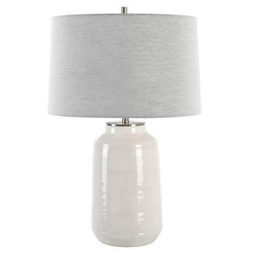 This Farmhouse Inspired Ceramic Table Lamp Features An Off-white Crackle Glaze With Subtle Horizontal Striped Detailing, Paired With Plated Brushed...