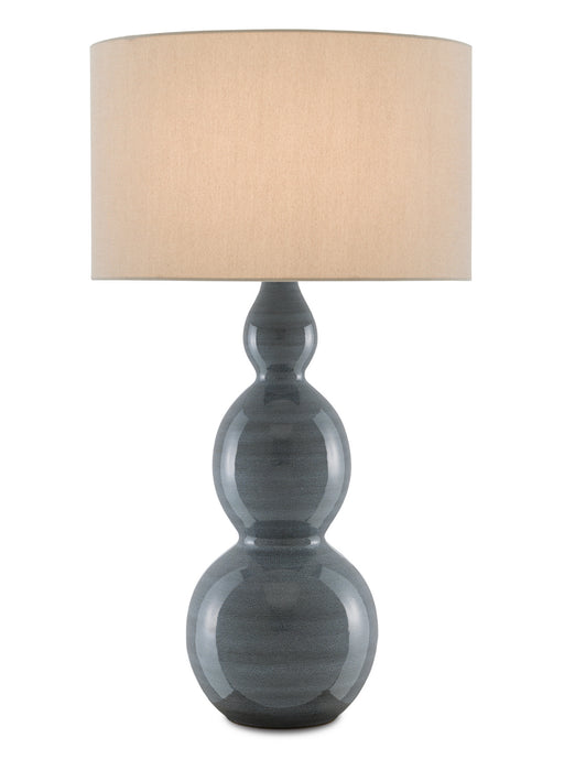 The Cymbeline Table Lamp has a triple-gourd shape with a surface that shines. The body of the lamp has a gray glazing that is stippled so delicatel...