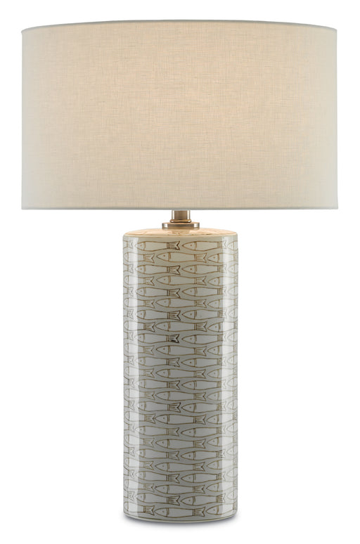 The Fisch Large Table Lamp has a fish pattern on the clean-lined porcelain column in gray and white. The antique nickel finish on the hardware echo...