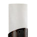 A softly rounded column of matte swirl glass is held by an English bronze-plated steel shield, perforated to let accents of light shine through. This linear style may also recall celestial constellations of the night sky.