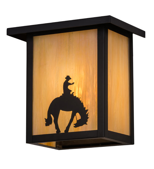 A young buck deer is depicted on this handsome American Craftsman lantern style solid mount wall sconce. The fixture, handcrafted in the USA by Mey...